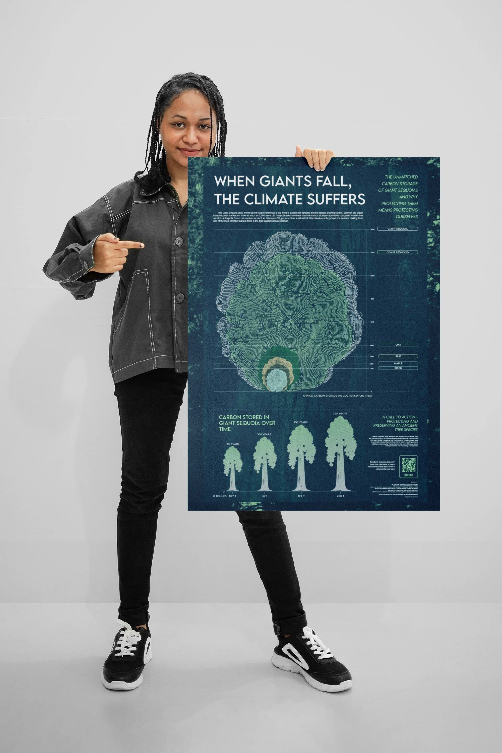 The aim of this project was to find an important or significant topic of our choosing and develop complex data into a poster that is easily understandable and focused on visuals. The topic I chose for this project revolves around the magnificent carbon storage capabilities of the Giant Sequoia tree species and their high importance to protecting our atmosphere and environment. I wanted to emphasize this by comparing the sequoia’s carbon capture storage to other miscellaneous tree species, and also draw interesting visual attention to the subject matter through imagery, typography, layout, copywriting, etc.